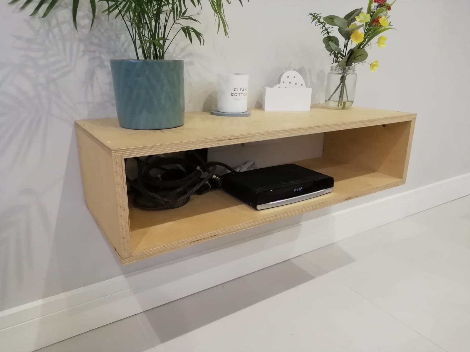 The unit is open at the front and back and is ideal for housing a Sky/BT box and hiding plug sockets behind.