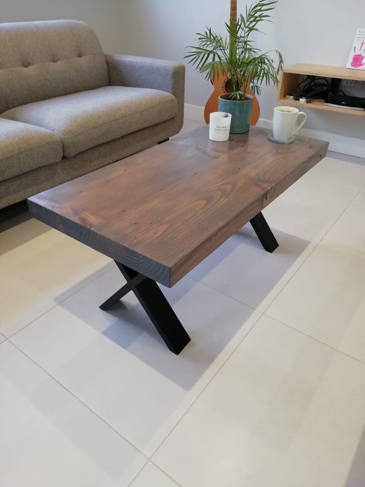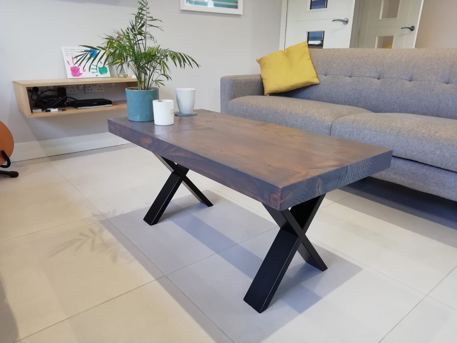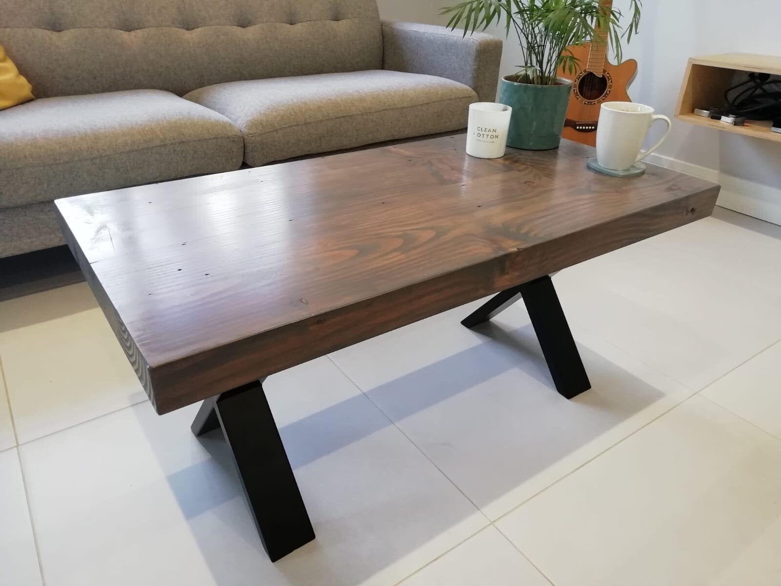 Chunky coffee table created from reclaimed redwood timber finished with a graphite stain.